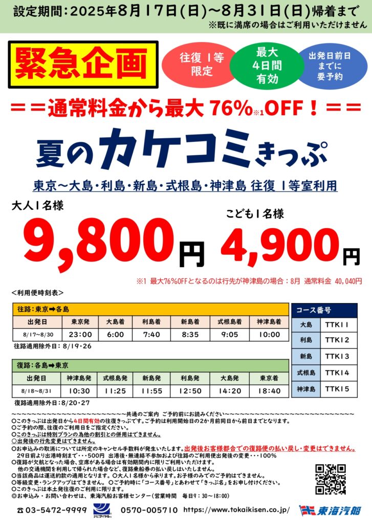 8月17日発から8月31日帰着までの大型船さるびあ丸の往復きっぷです。(除外日あり)